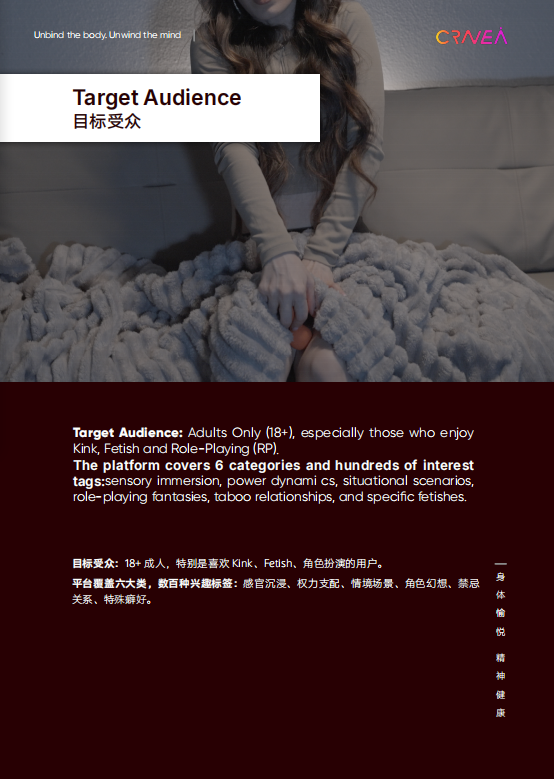 Target audience: 18+ adults, especially users who like Kink, Fetish, and roleplay. The platform covers six categories and hundreds of interest tags: sensory immersion, power domination, situational scenes, character fantasies, taboo relationships, and special fetish groups.